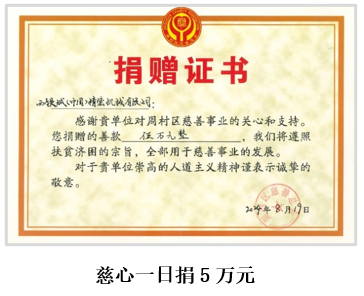 2024年8月份慈心一日捐,公司捐款5万元,同年11月份再捐款3千元教育慈善基金,共计捐赠5.3万元。提升奉献意识,弘扬社会正能量,营造了“人人关心慈善、人人支持慈善、人人参与慈善”的良好氛围。获得了当地政府的多次好评,并荣获“尊师重教先进单位”荣誉称号。