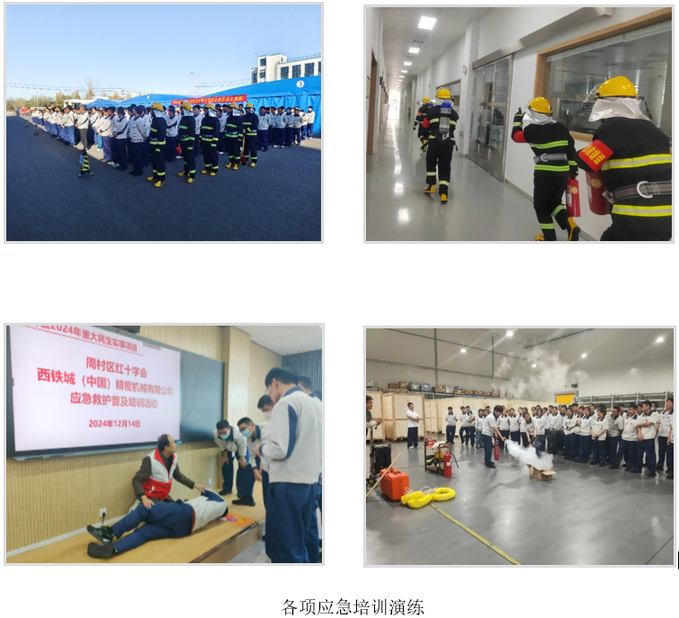2024年度开展消防综合逃生演练、车辆伤害专项应急演练、机械伤害现场处置方案演练、仓储物体打击现场处置方案演练、火灾事故现场处置方案演练、检维修中暑事故处置方案演练等,共计13次。